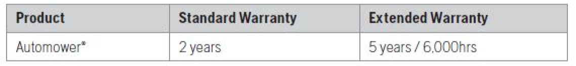 To extend the standard warranty to a total of 5 years or 6,000 working hours the Automower® must be serviced annually by an authorised Husqvarna Servicing Dealer AND the consumer must purchase a cleaning and maintenance kit with the Automower® at point of purchase. Automower® must not exceed manufacturers recommenced working area.